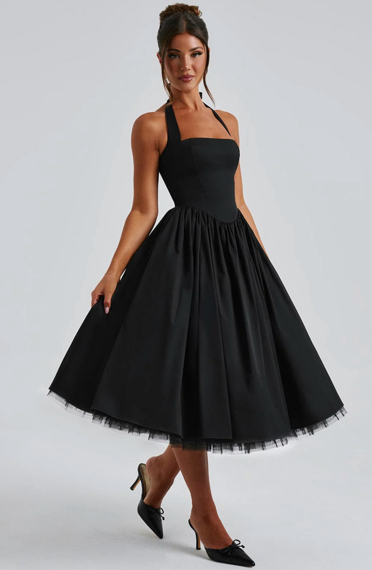 Elevate your evening look with our Luxe Mesh Backless Midi Dress. Featuring a halter neckline, slim-fit silhouette, and elegant mesh detail, this dress blends modern glamour with timeless sophistication. Perfect for luxe nights out or special occasions.